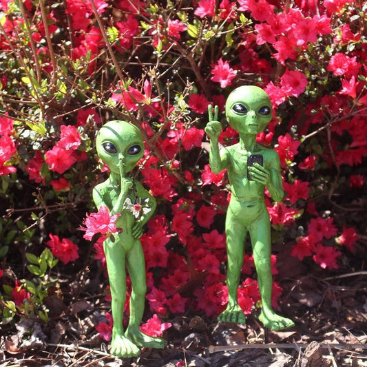 Standing Aliens "Peace & Quiet" 10 IN Tall Garden Stakes Set: Green