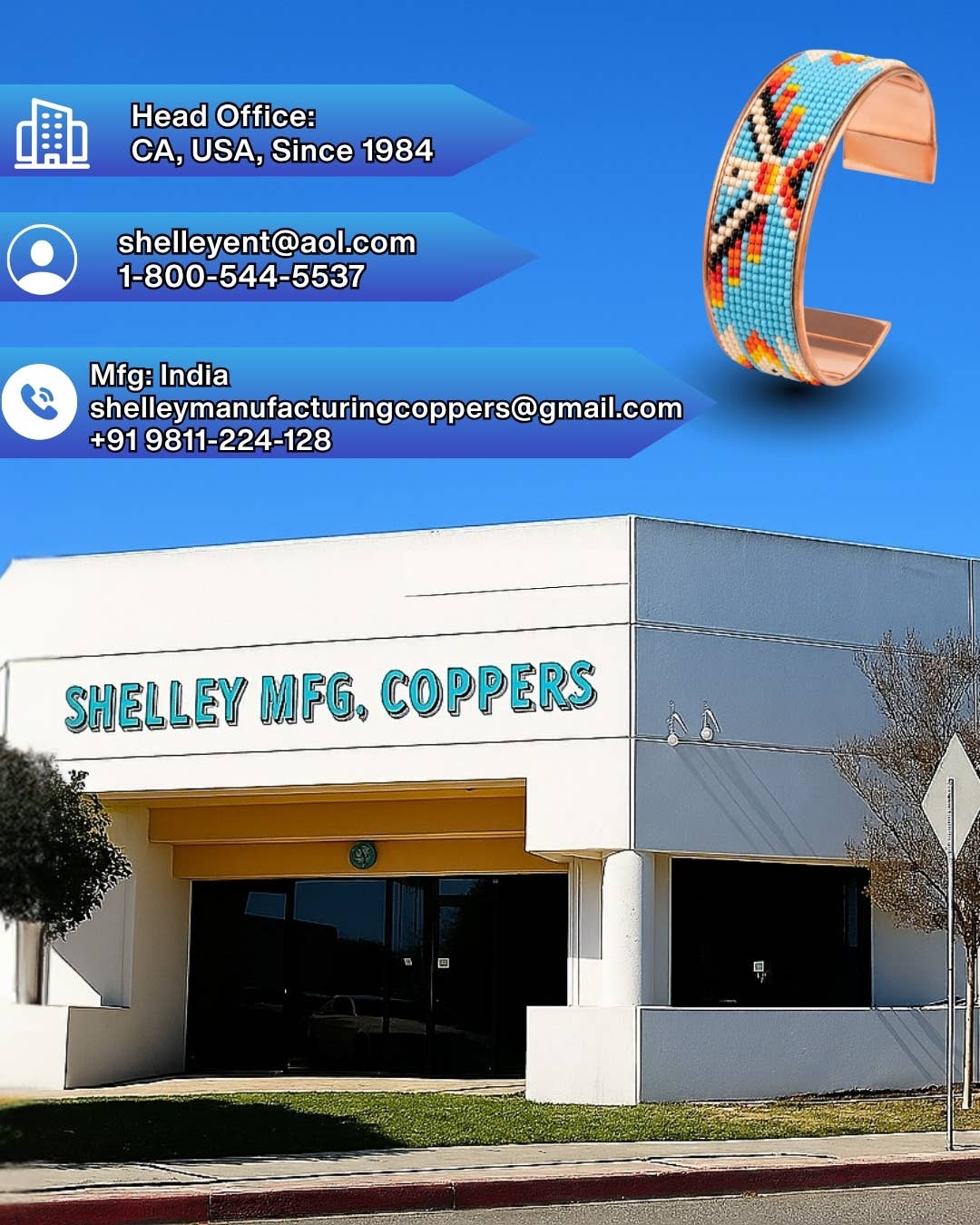 #699-1' Pure Copper Native Style handmade with a woven strip using high-quality Czech beads, inset into a warm, rustic pure copper base. Beadwork features bold, native-inspired patterns in vibrant reds, blacks, turquoise and neutrals, offering a striking contrast.