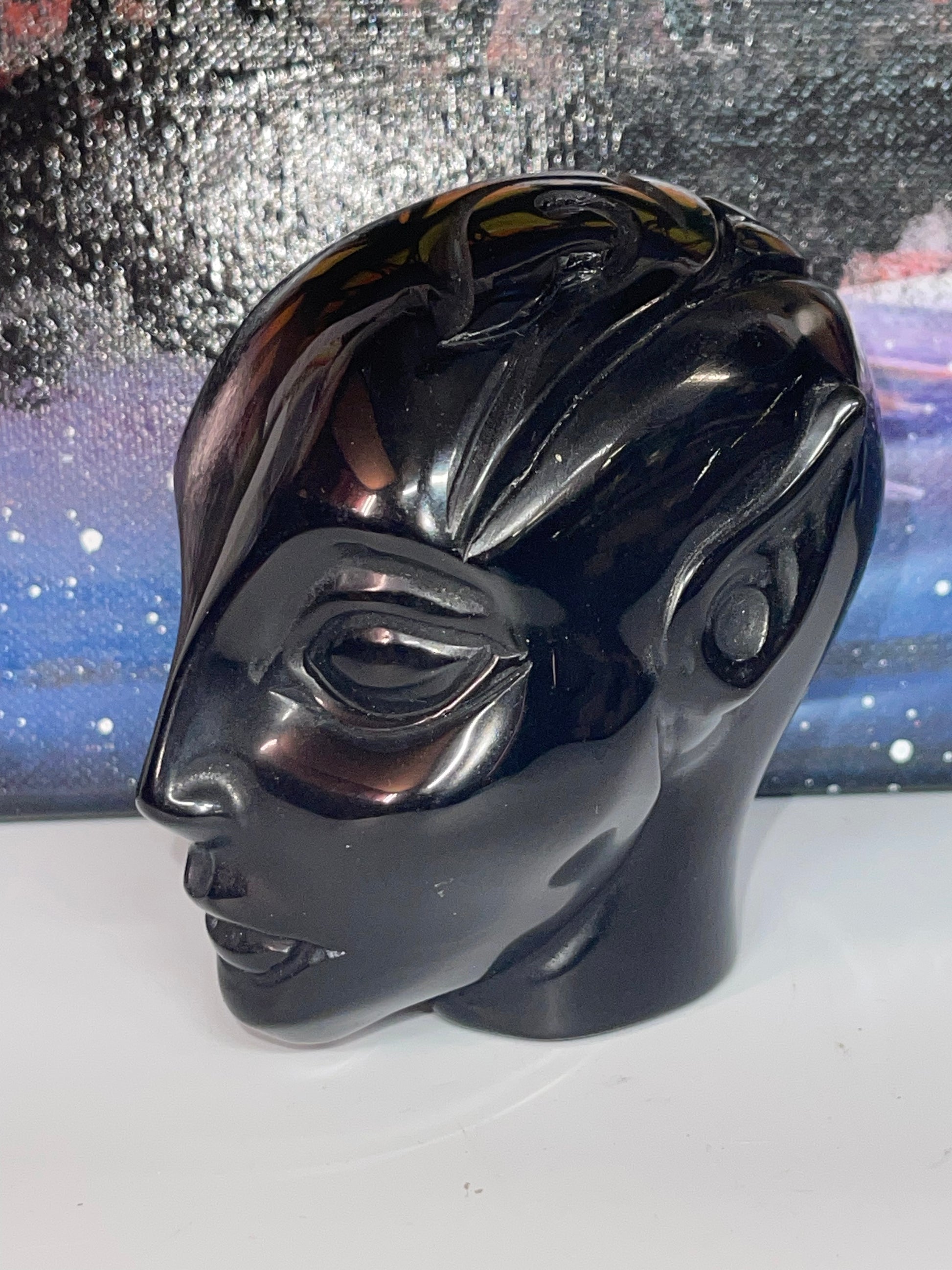 This unique carving features a female alien head made from black obsidian crystal. Formed from volcanic glass, this crystal is known for its protective properties and is believed to bring clarity to the mind. A must-have for any crystal collector or cosmic enthusiast.