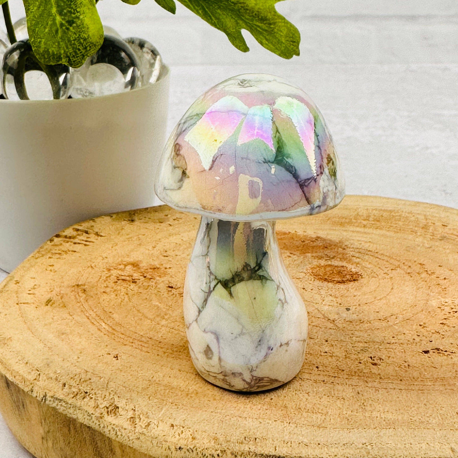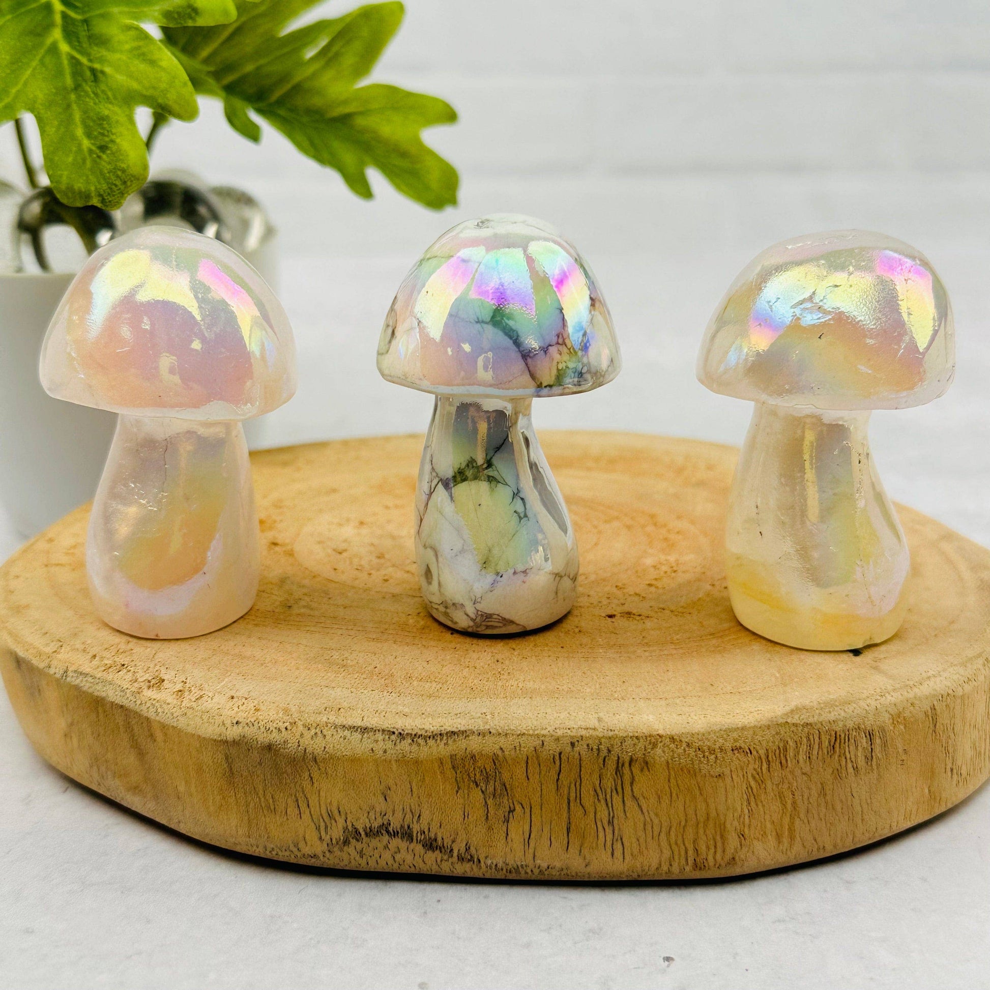 These titanium treated angel aura finished mushrooms are the perfect addition to your alter, garden, or desk décor. These mushrooms give off the perfect forest enchantment vibes to any setting. They are all polished to give off as much color and light as possible. The mushrooms make as a perfect little gift to give someone or to keep for yourself.