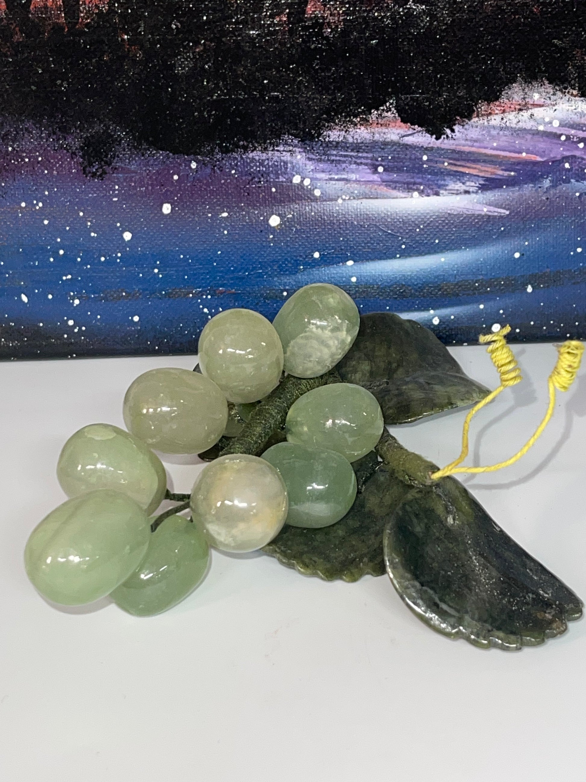 Elevate your home decor with our Green Jade Grapes. Each grape is crafted from green jade and adorned with delicate, handmade leaves. The crystal carving adds a touch of elegance to this unique piece. Bring natural beauty into your space with these stunning grapes.